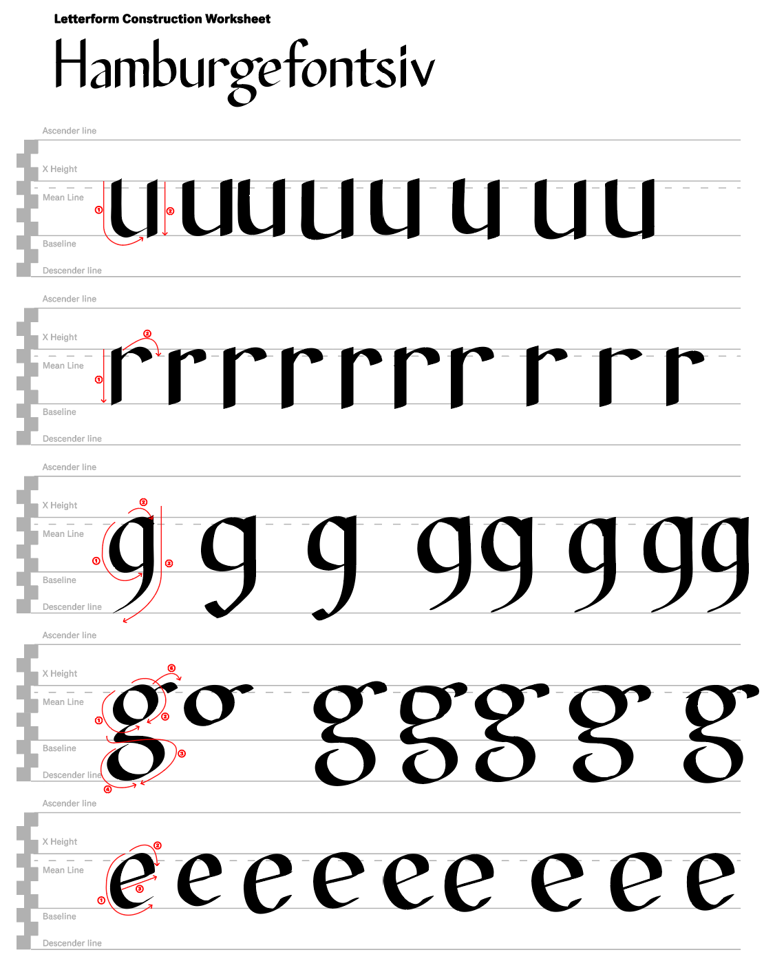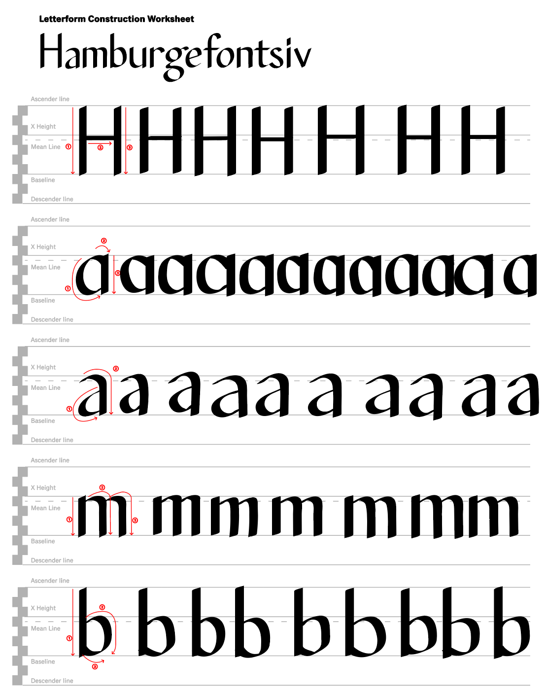 This is the fourth and last sheet used to practice creating the letters for the "Hamburgefontsiv" in Illustrator. This page also includes experiments with the spacing (tracking) of the letters in the word Hamburgefontsiv.