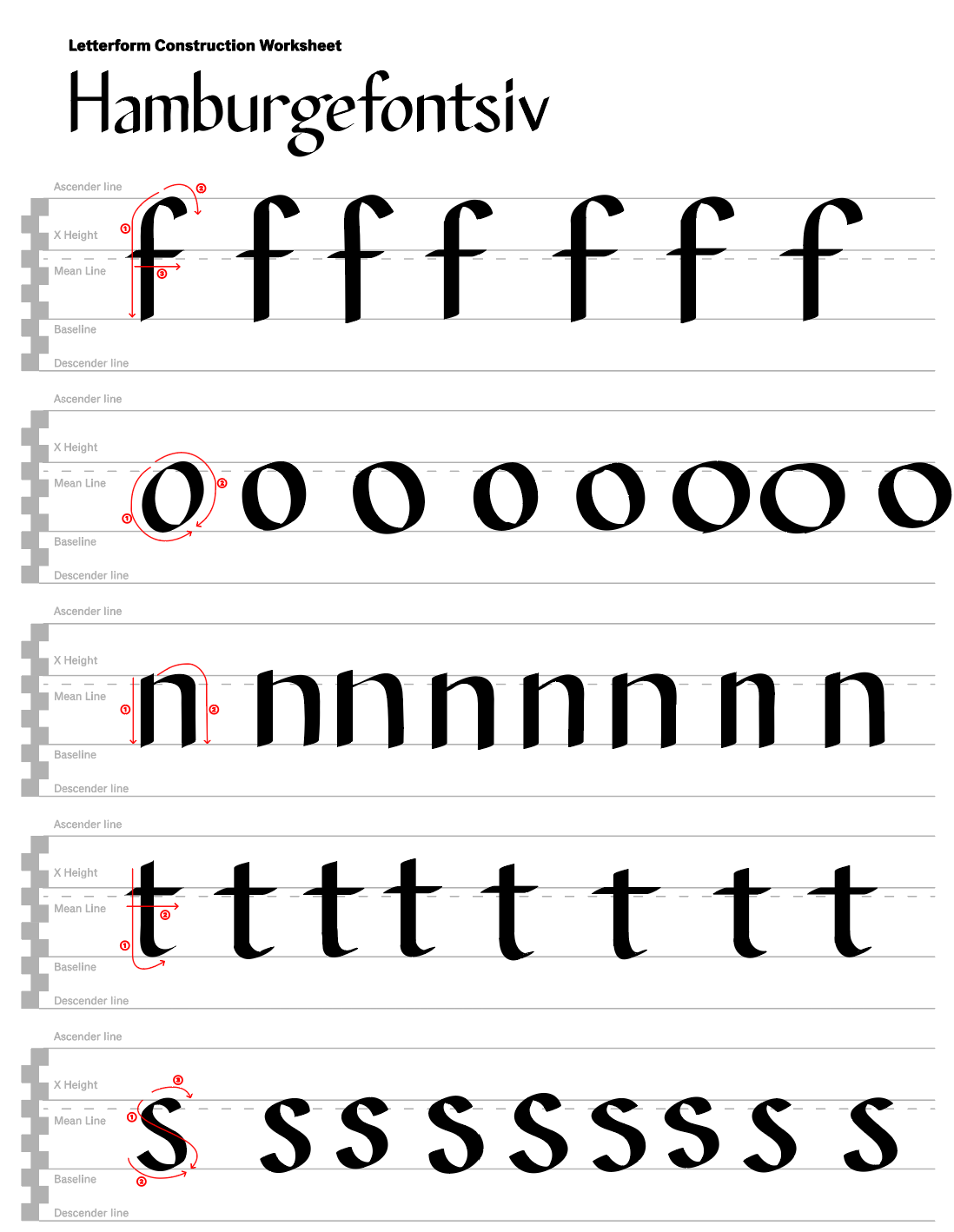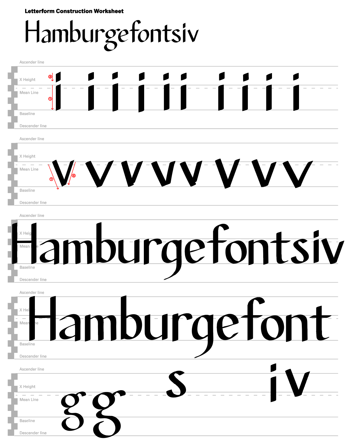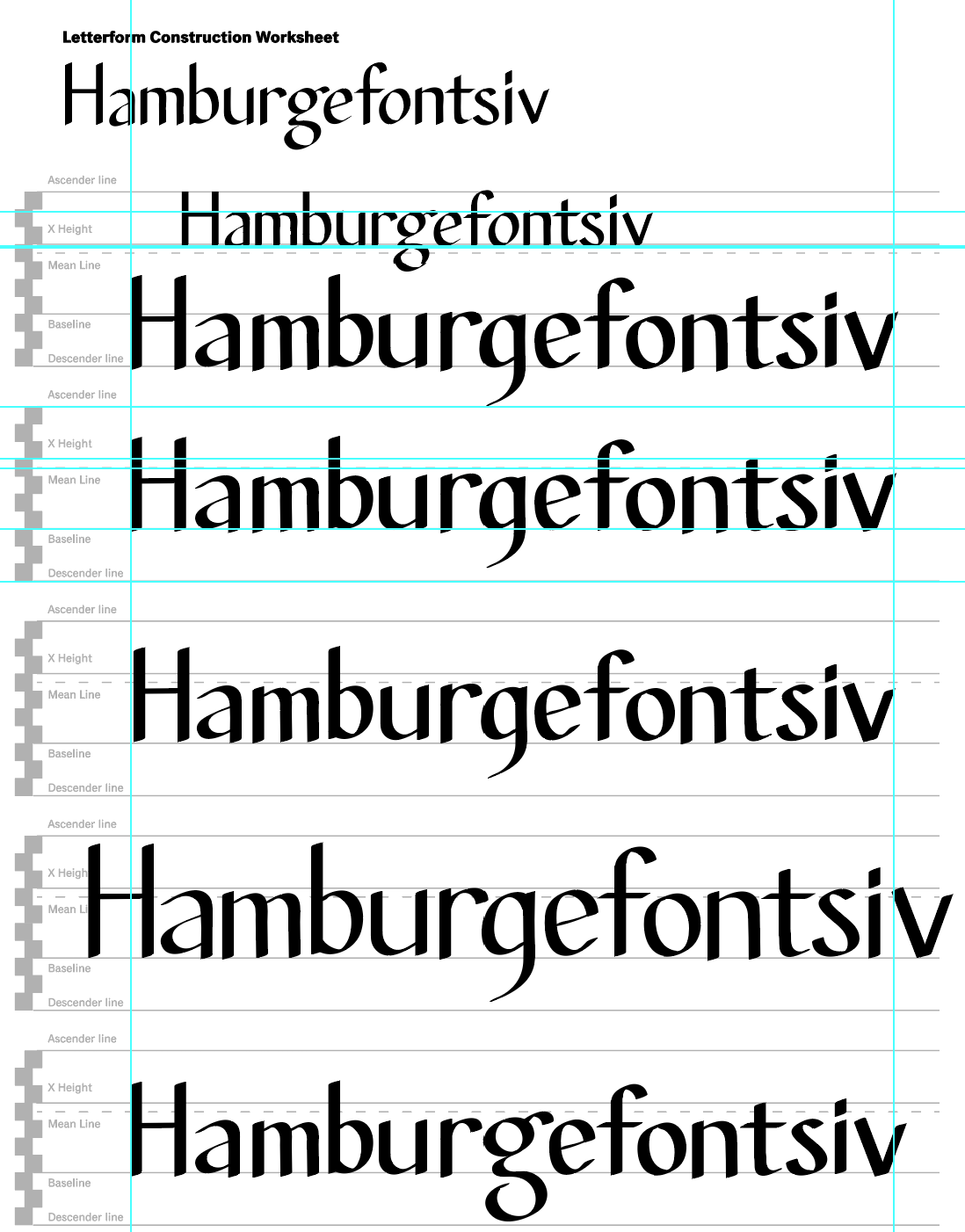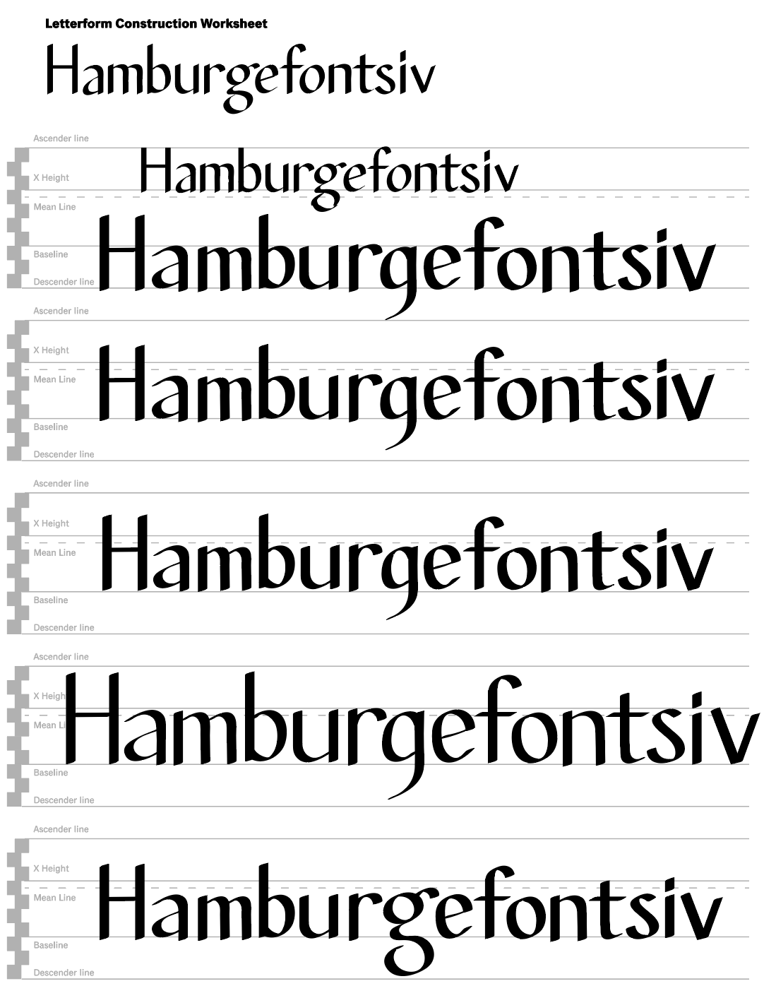 This is the fourth and last sheet used to practice creating the letters for the "Hamburgefontsiv" in Illustrator. This page also includes experiments with the spacing (tracking) of the letters in the word Hamburgefontsiv.